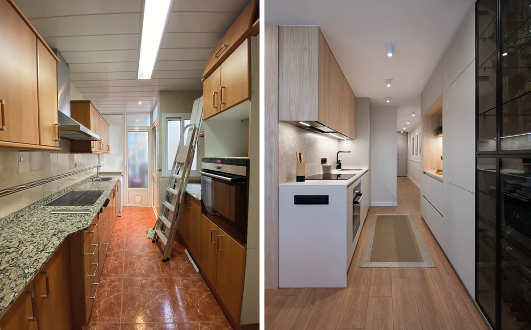 Inicialmente, la cocina estaba cerrada y sin luz natural. El nuevo diseño la reubicó junto al salón, eliminando un tabique para crear una zona diáfana, amplia y luminosa. Una isla alberga la zona de cocción, mientras que el frente lineal concentra armarios columna con electrodomésticos y almacenaje. La zona de agua está en la parte central, optimizando funcionalidad. Descubre más en nuestro proyecto El Putxet.