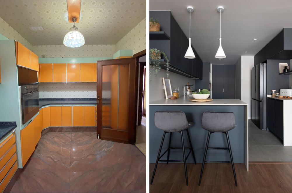 La reforma del proyecto Tamarit apostó por modificar la distribución para lograr un espacio central abierto y luminoso, uniendo salón y cocina que antes estaban separados. Esta nueva disposición optimiza la luz natural y crea un ambiente fluido, respetando la privacidad con dos áreas independientes de dormitorios y baños a ambos lados. La cocina, protagonista del proyecto, es amplia y funcional, con una península con barra, rincón para café y gran espacio de almacenamiento. La zona de lavado está oculta tras una puerta plegable que se integra con el mobiliario. Estéticamente, el contraste entre tonos oscuros y elementos claros como la encimera y el frontal aporta sofisticación y calidez.