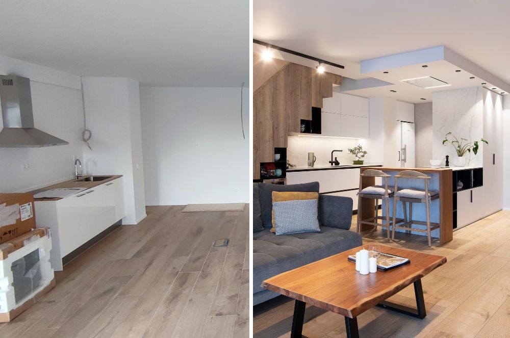 Reforma Avinguda de Roma donde se transformó integralmente un piso de segunda mano convirtiéndolo en una vivienda bonita, funcional y moderna. Inicialmente presentaba un aspecto antiguo e importantes fallos de distribución debido a una excesiva compartimentación. La cocina le daba la espalda al resto de la vivienda por lo que se ubicó junto al salón para crear un espacio más social e incrementar la entrada de luz natural. Con una península, mucho espacio de almacenamiento, y donde se ha utilizado el color blanco, tanto en el mobiliario como en los electrodomésticos y la encimera, para conseguir un espacio visualmente más amplio, luminoso y sofisticado.