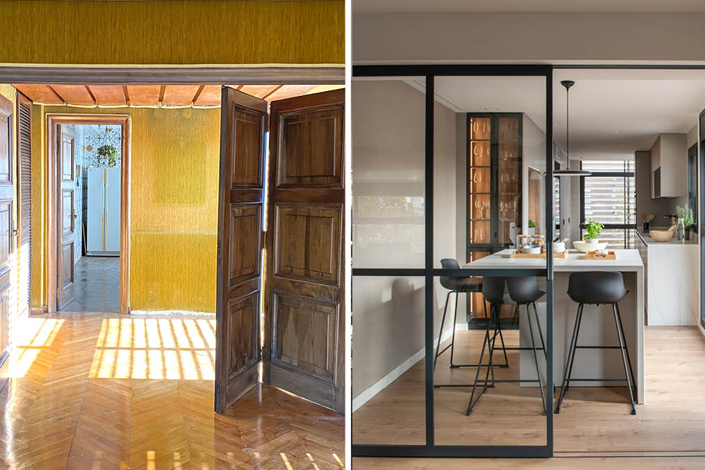 En el proyecto Travessera de Gràcia, los propietarios reformaron el inmueble para adaptarlo a su estilo de vida. La cocina se trasladó a la estancia de enfrente y se abrió, ubicando la isla junto a la mesa de comedor. Destaca la bóveda catalana en el techo del salón, que aporta personalidad y divide visualmente los ambientes.