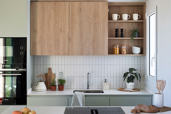 The project’s aesthetic is based on a simple design with sophisticated details. The project’s aesthetic is based on a simple design with sophisticated details. Natural materials like wood and stone effect dominate, combined with warm tones that create a cozy and elegant atmosphere. A refined contrast is achieved between the darker flooring and the light-colored furniture, adding character to the space.