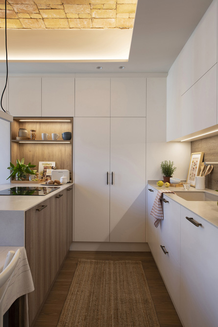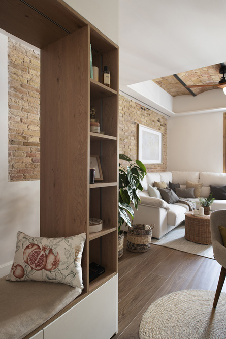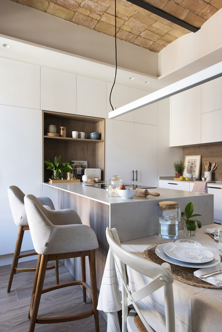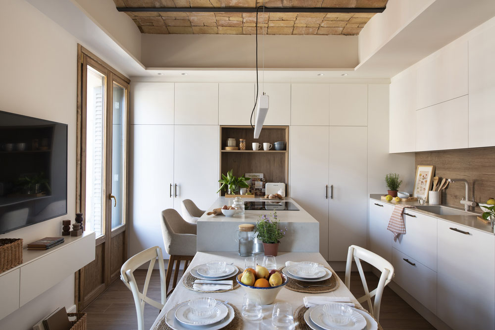 A nivel estético, el proyecto ha puesto en valor los elementos originales, como la bóveda catalana, la pared de ladrillo visto y las carpinterías de madera. Estos se han convertido en el hilo conductor de la propuesta, a partir del cual se ha seleccionado el resto de materiales. Se ha buscado un equilibrio cuidado, evitando la sobrecarga visual, mediante el uso de tonalidades claras en el mobiliario que contrastan con la fuerza del pavimento y de los materiales nobles, creando un ambiente cálido y acogedor.