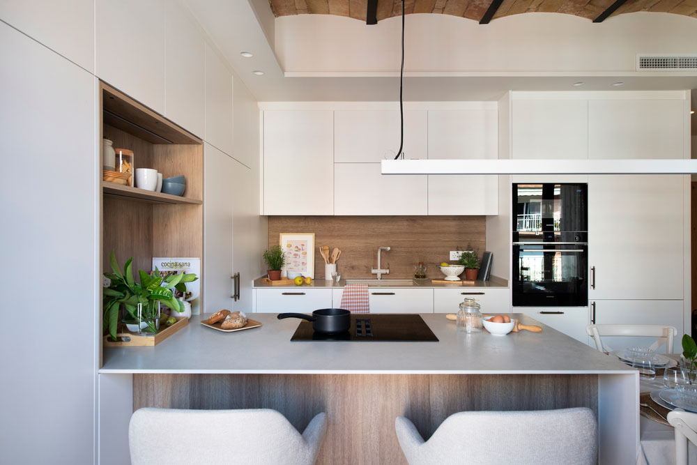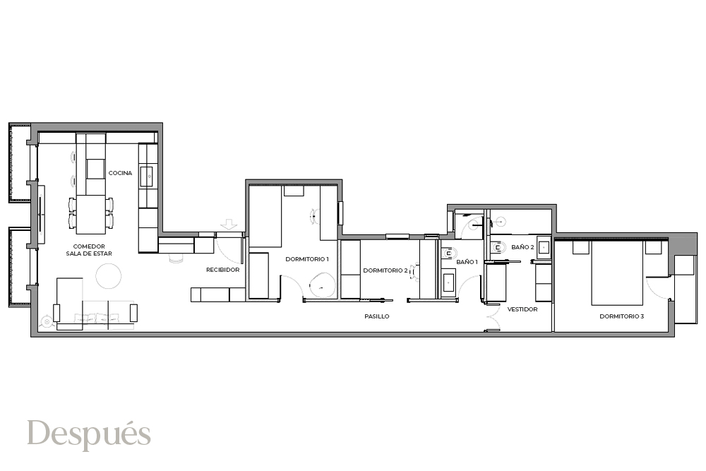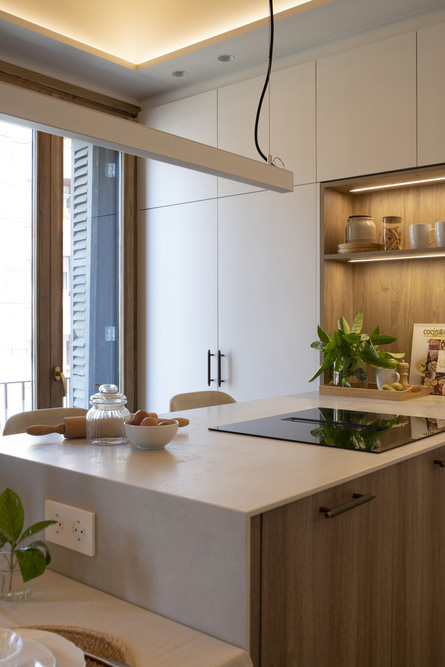 El objetivo principal de este proyecto ha sido definir con claridad la separación entre la zona de día y la zona de noche. Por un lado, se ha creado una cocina abierta al comedor y a la sala de estar, ubicada en la fachada principal de la vivienda, donde se sitúan los balcones. Esta intervención ha permitido configurar un espacio único y luminoso, aprovechando al máximo la entrada de luz natural.