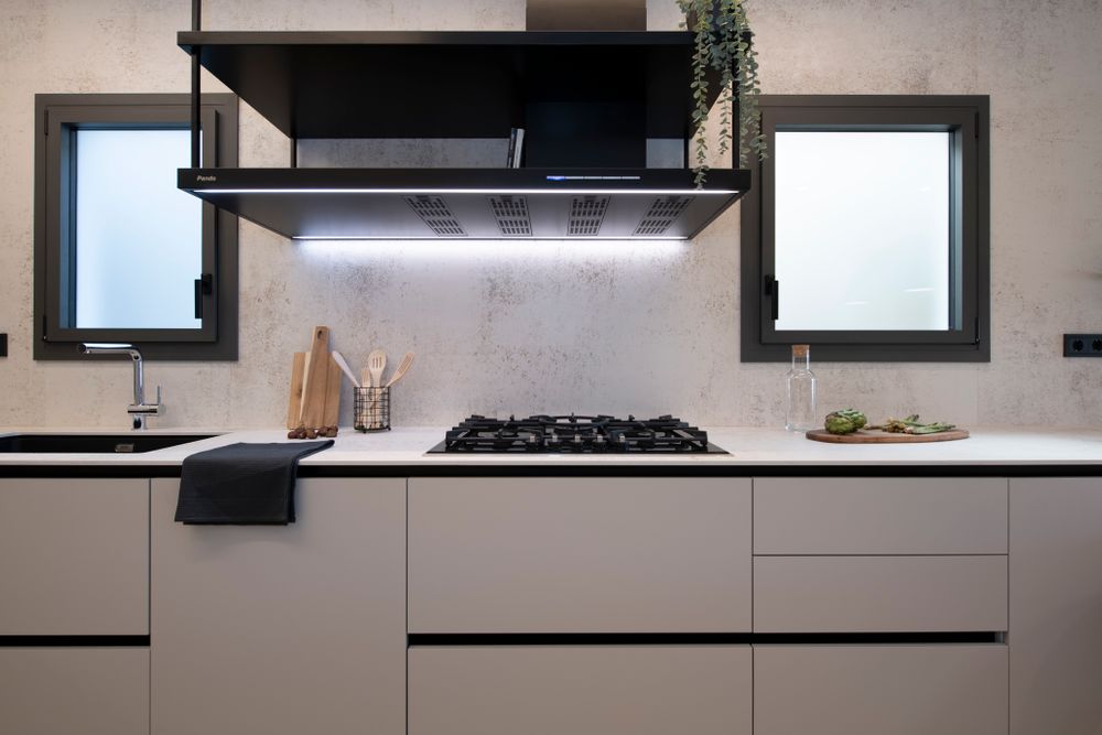 La cocina era otro punto clave ya que les gusta mucho cocinar. Después de la reforma se ha conseguido una cocina moderna y grande, abierta al salón, compuesta por una gran variedad de módulos, consiguiendo una muy funcional y práctica. La campana extractora decorativa de Pando aporta diseño y personalidad siendo la protagonista absoluta de esta cocina. Tanto en la encimera como en todo el frontal se ha utilizado un material Dekton modelo Nillum inspirado en la estética industrial que presenta una mezcla de colores cálidos que combina a la perfección con el resto de tonalidades presentes en este espacio. Otro elemento a destacar es la alfombra cerámica presente en el pavimento que otorga más dinamismo visual y mayor impacto.