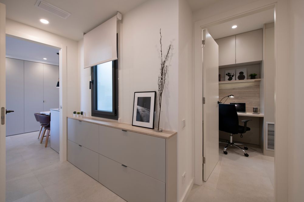 Por toda la vivienda se han instalado muebles a medida del fabricante Tegar para optimizar al máximo todos los espacios. Destacar el armario de la pared del cabecero, el mueble del salón compuesto por diferentes módulos (armarios, vitrinas, cajones y estantes), el zapatero ubicado en el pasillo, el armario con un pequeño despacho integrado y los armarios empotrados a la pared.