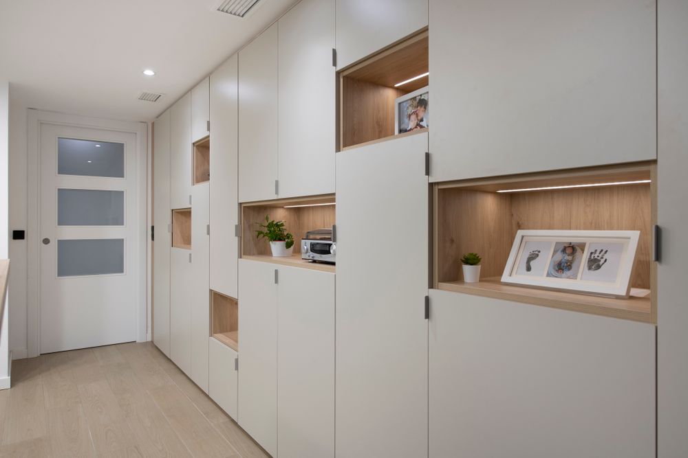 Del salón destacar el gran armario, que recorre todo un muro de la zona de paso de la cocina abierta, con puertas batientes y diferentes módulos diáfanos añadidos con iluminación LED y revestidos con otro acabado, jugando un papel muy importante en la decoración de este ambiente.