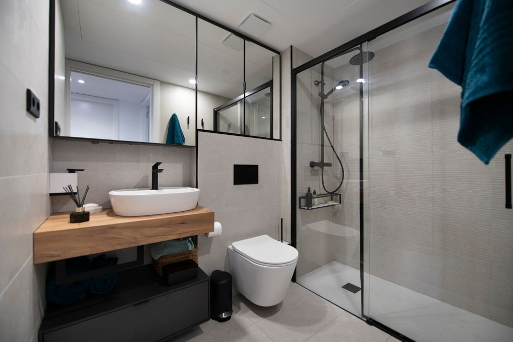 Los dos baños se han dotado con módulos de almacenamiento, como los armarios altos con espejo y el mueble de debajo del lavabo. Y han sido equipados con todos los accesorios.