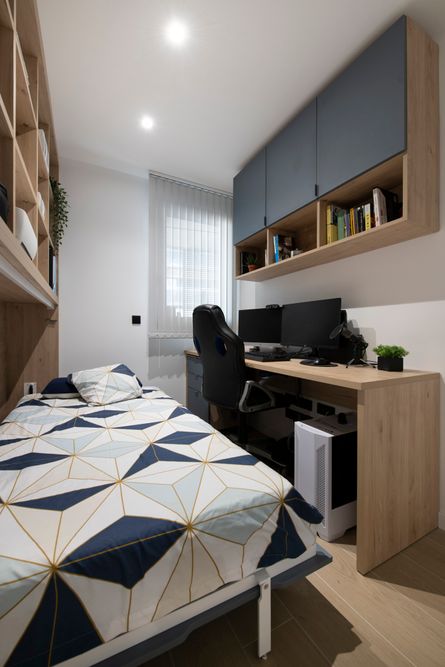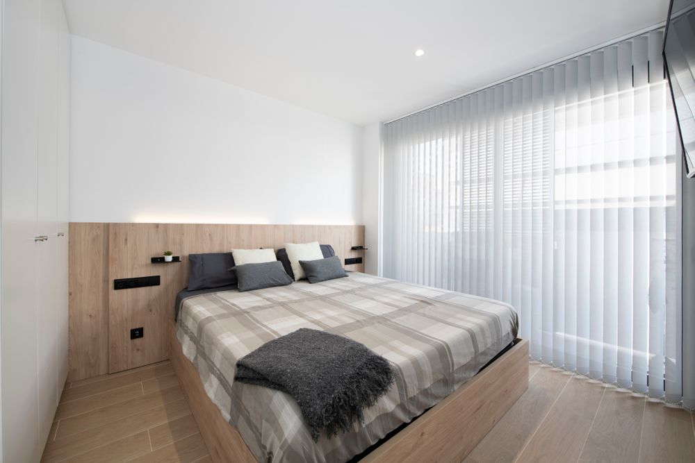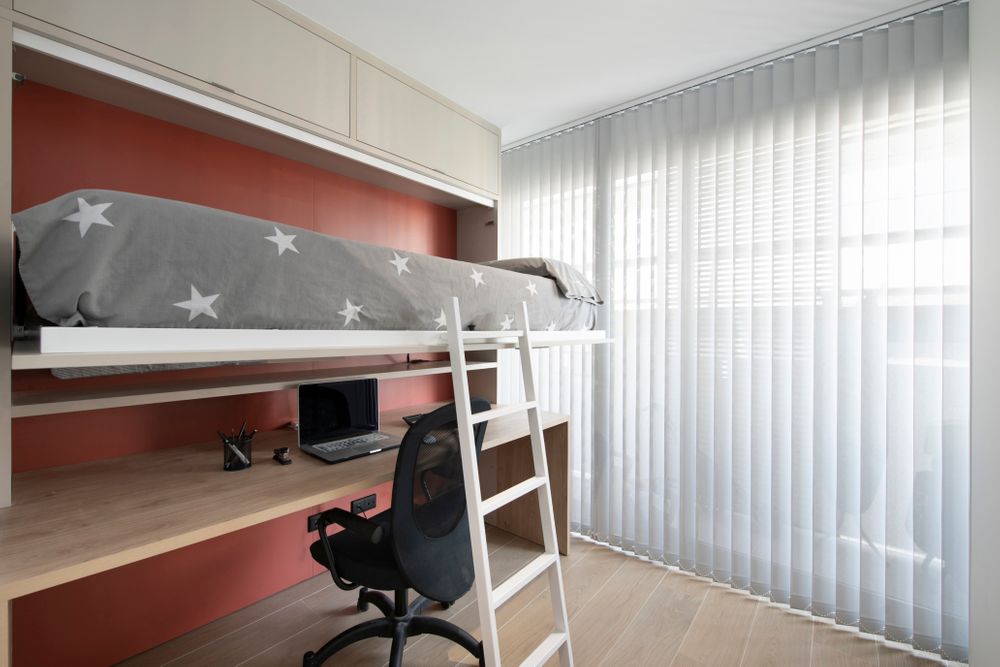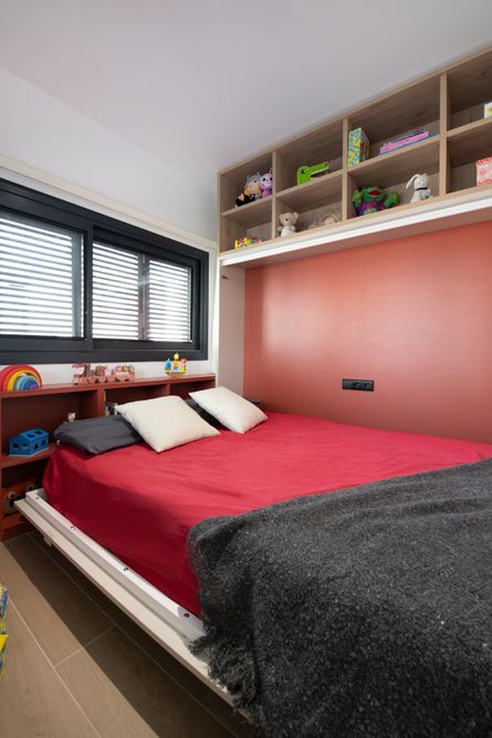 En el dormitorio principal se ha instalado un canapé con el cabecero a conjunto. El resto de habitaciones presentan armarios con camas abatibles para ganar espacio y poderlas utilizar para más actividades. Una de ellas corresponde al dormitorio infantil con mucho espacio de almacenaje para poder guardar todos los juguetes y demás cosas. Y el resto, dos despachos totalmente equipados para trabajar desde casa y con una cama extra para poder alojar a sus invitados, y para un futuro para disponer de dos dormitorios cuando los hijos sean un poco más mayores.