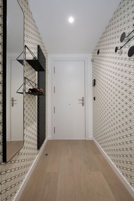 Finalmente el recibidor, que se ha decorado con papel pintado, en blanco y negro, para que cause más impacto al entrar y se ha colocado un colgador y dos pequeños estantes de metal en acabado negro en la pared.